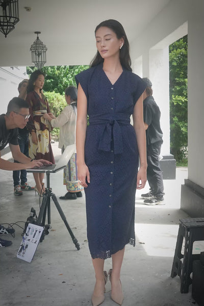 Stand Collar Pencil Dress (Navy Lace)