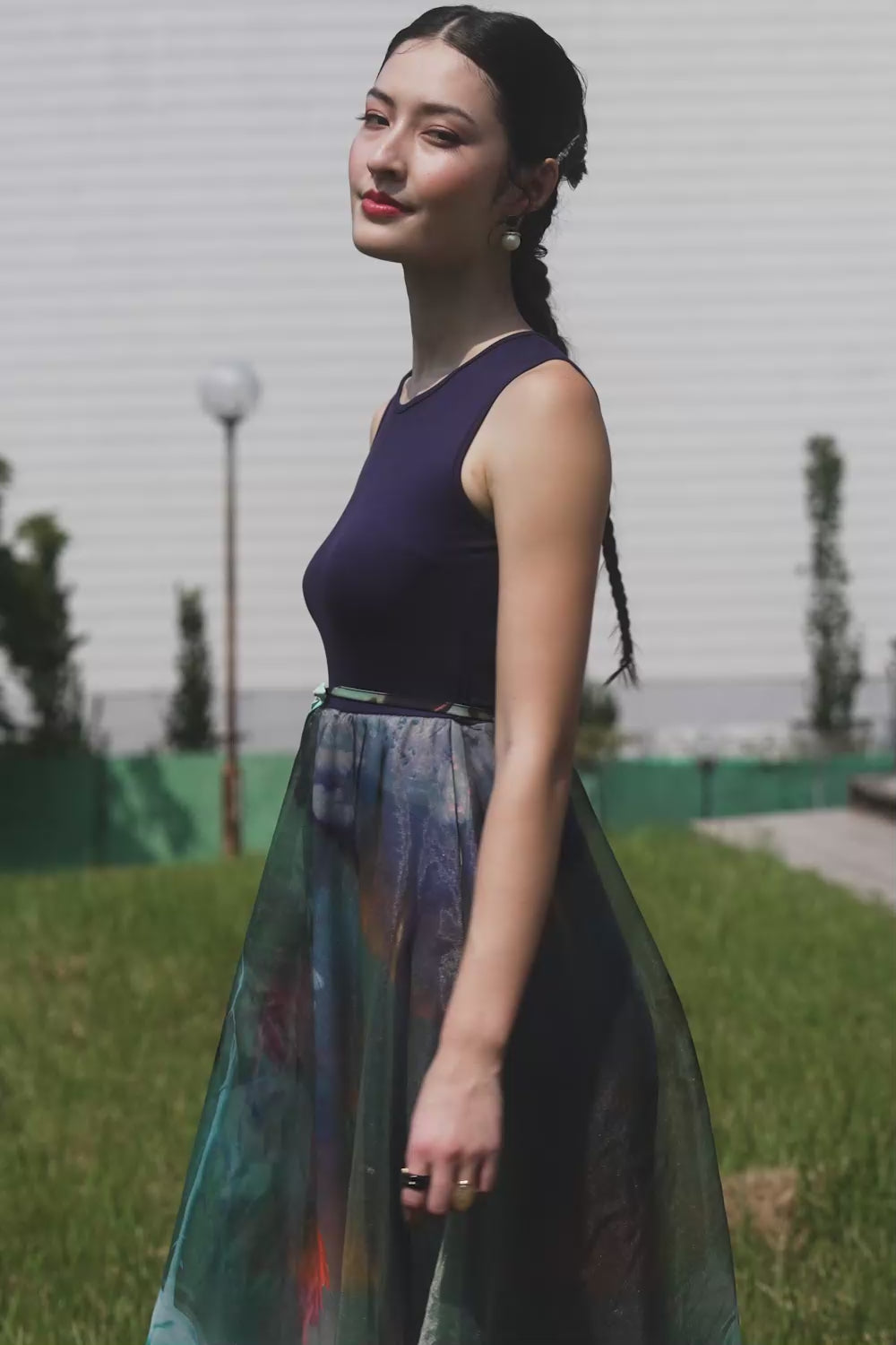 Ribbed Sleeveless Drawstring Swing Dress (Celestial)Ribbing, Liquid Organza, Rayon