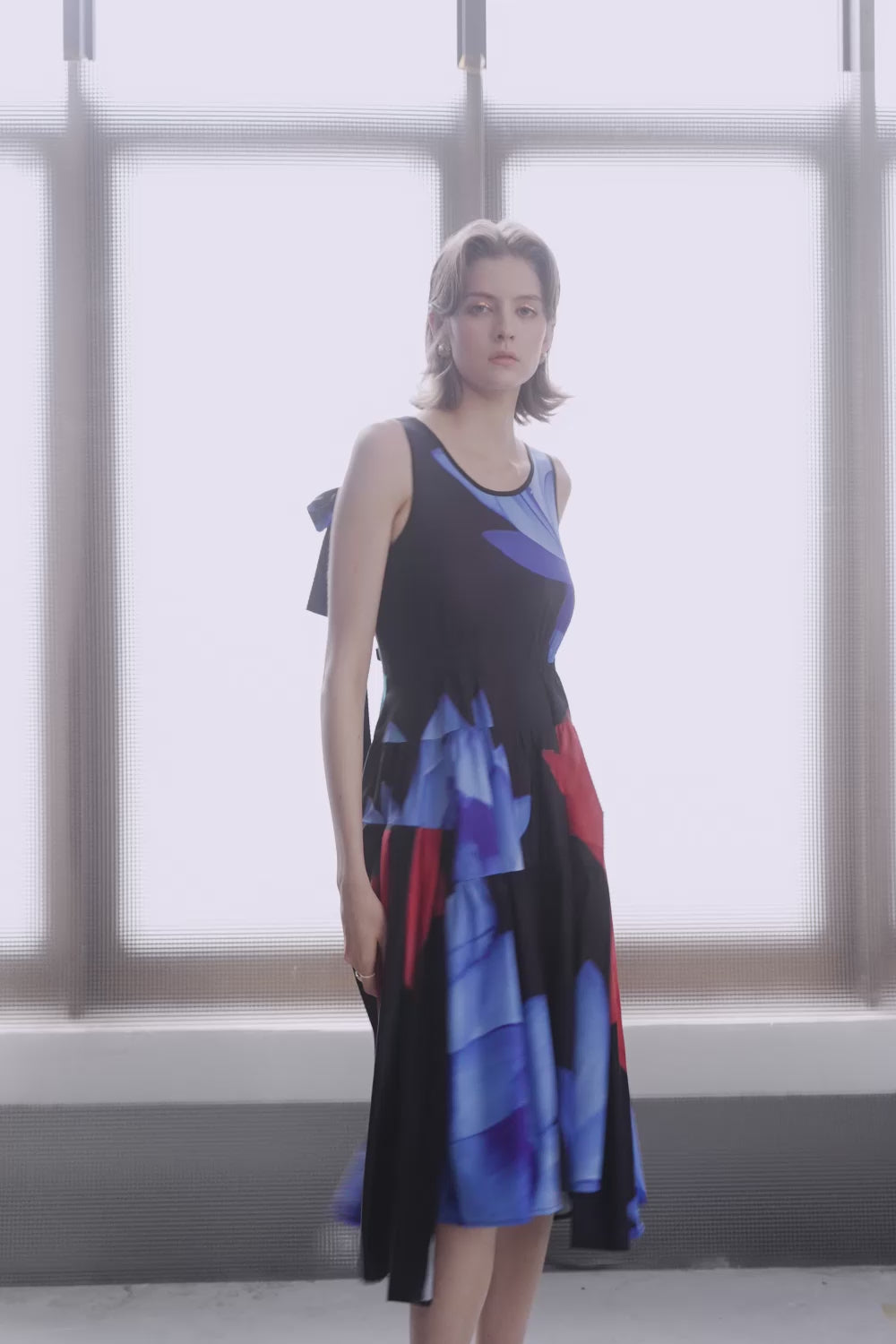 Our Billowing Midi Dress moves with intention—fluid yet structured, bold yet effortless. A collision of deep indigo, charged cerulean, and ambered red against black—evokes bold brushstrokes, balancing structure with fluidity.