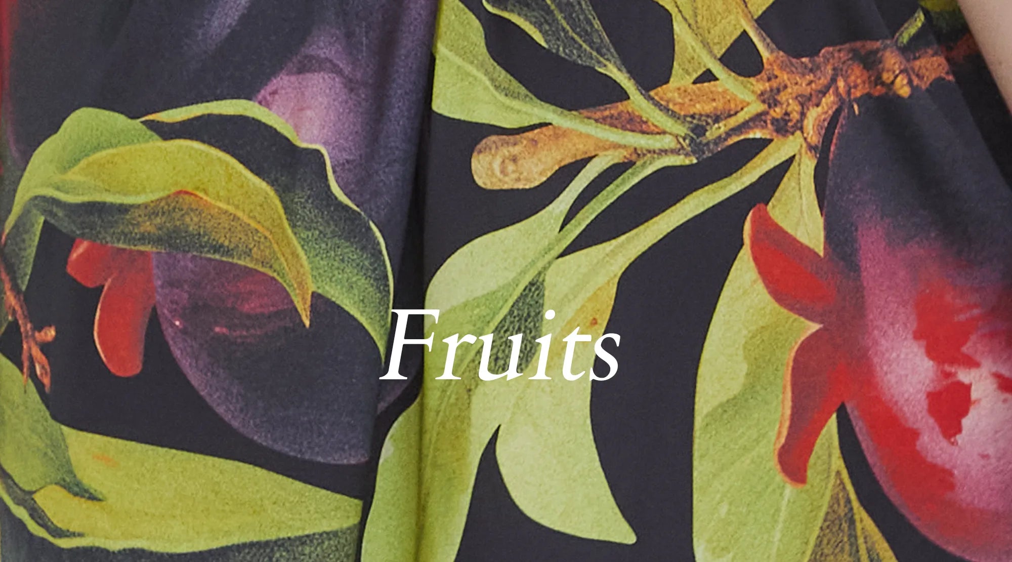 A refined ode to nature’s bounty, this collection interprets fruit through elegant motifs and modern silhouettes. Subtle yet striking, it’s freshness with a polished edge.