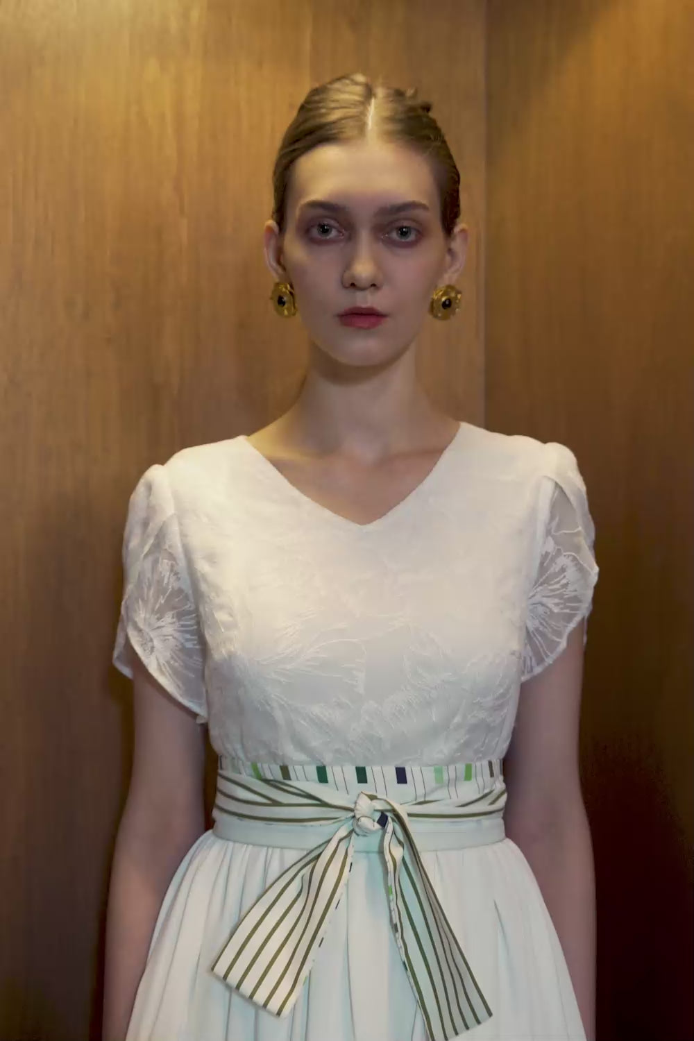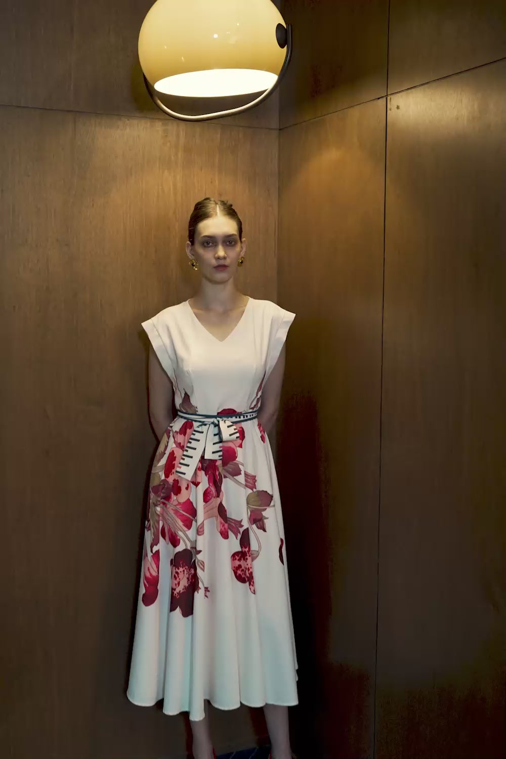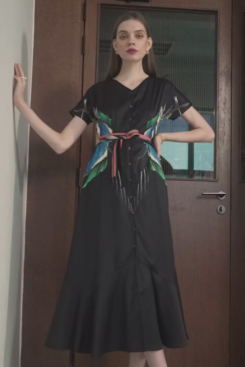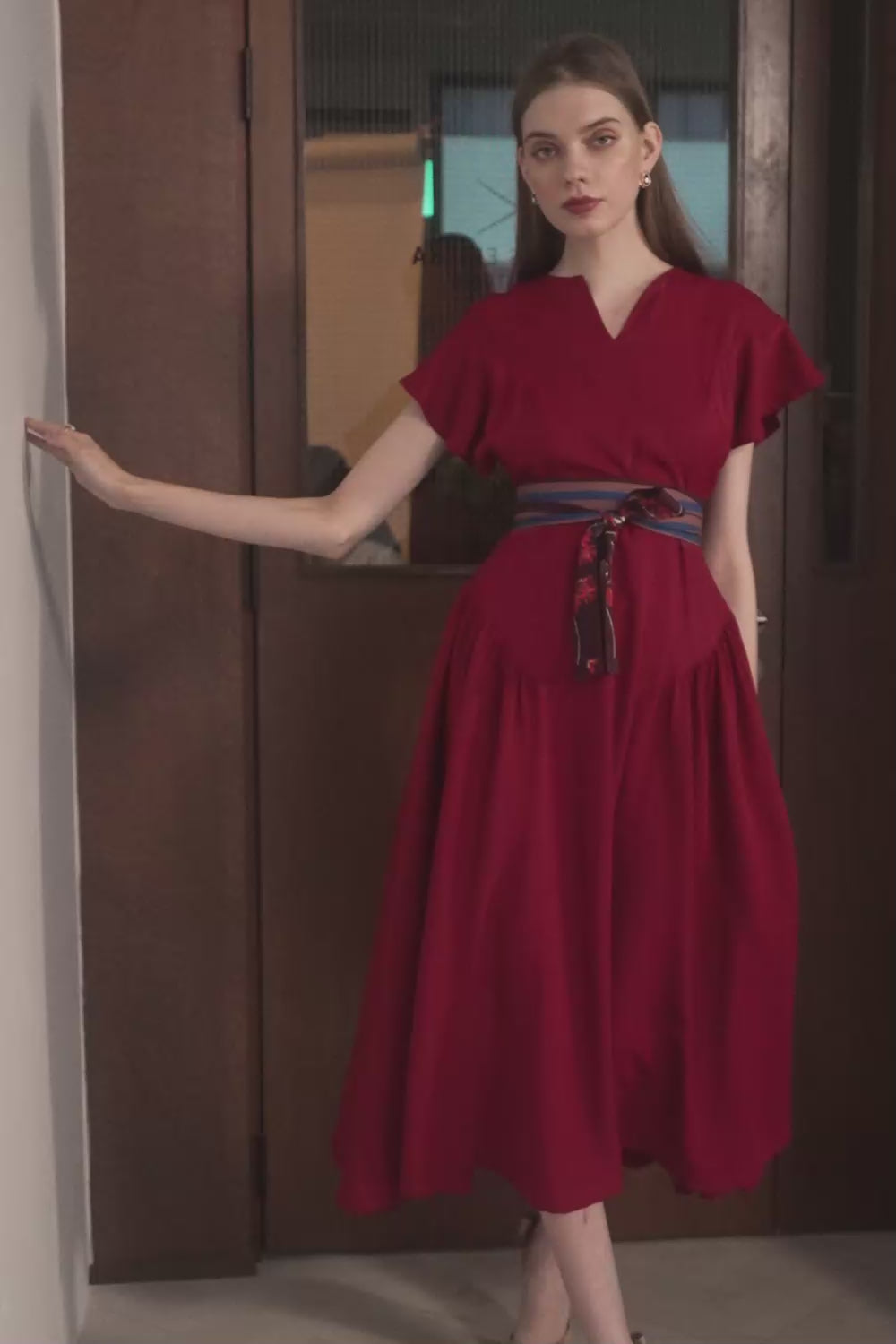 Flutter Sleeves Box Pleats Cinch Midi Dress (Dendrobium)Microfiber Polyester (Mimics Cotton)