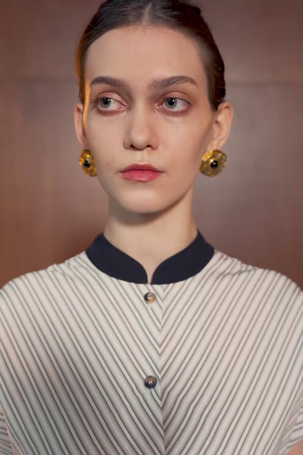 Chinese Collar Fit & Flare Maxi Dress (Grey Blue Stripes)Microfiber Polyester (Mimics Cotton)