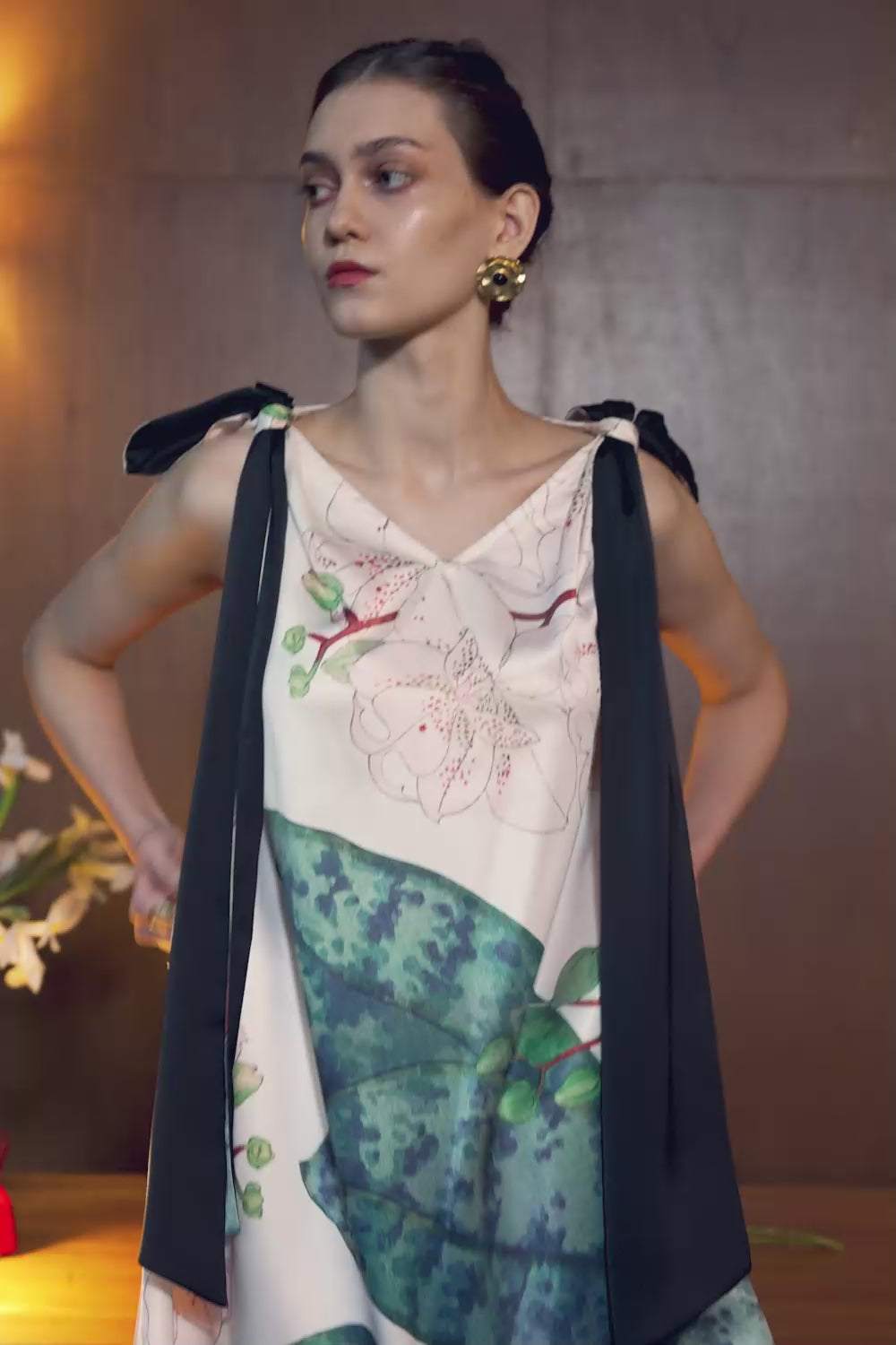 Pankou Slit Empire Dress (Yellow-Throated Vireo)Microfiber Polyester (Mimics Rayon), Matte Satin