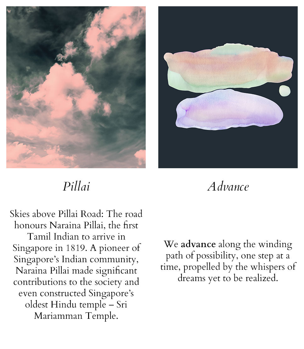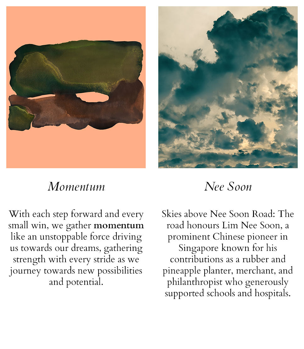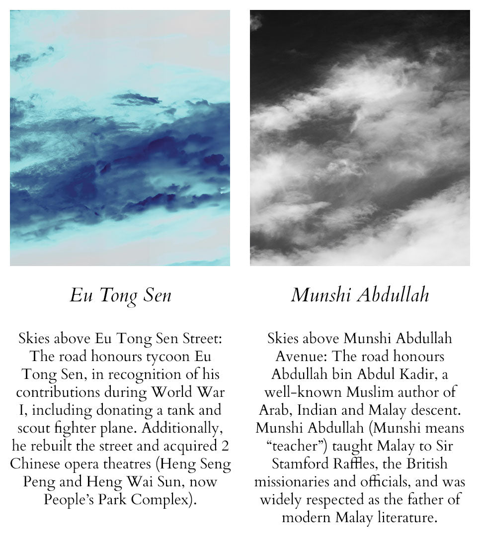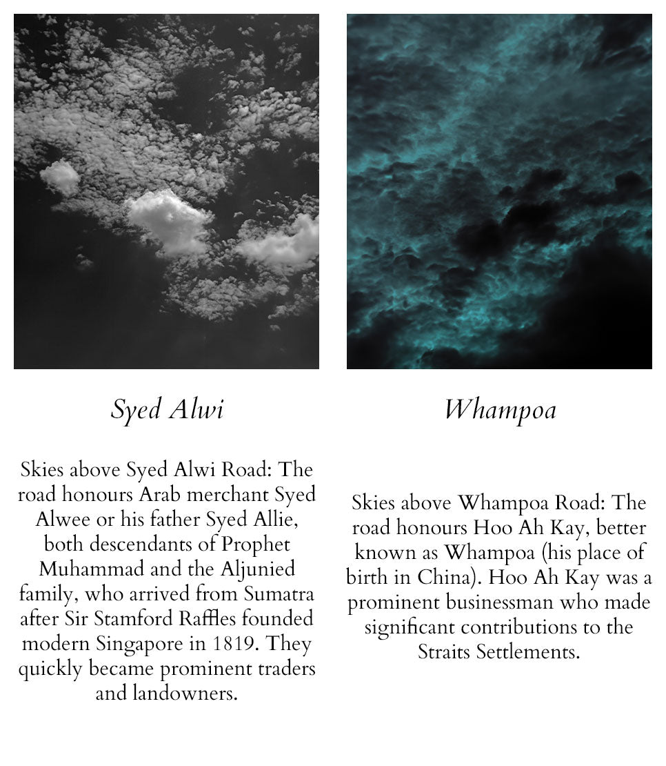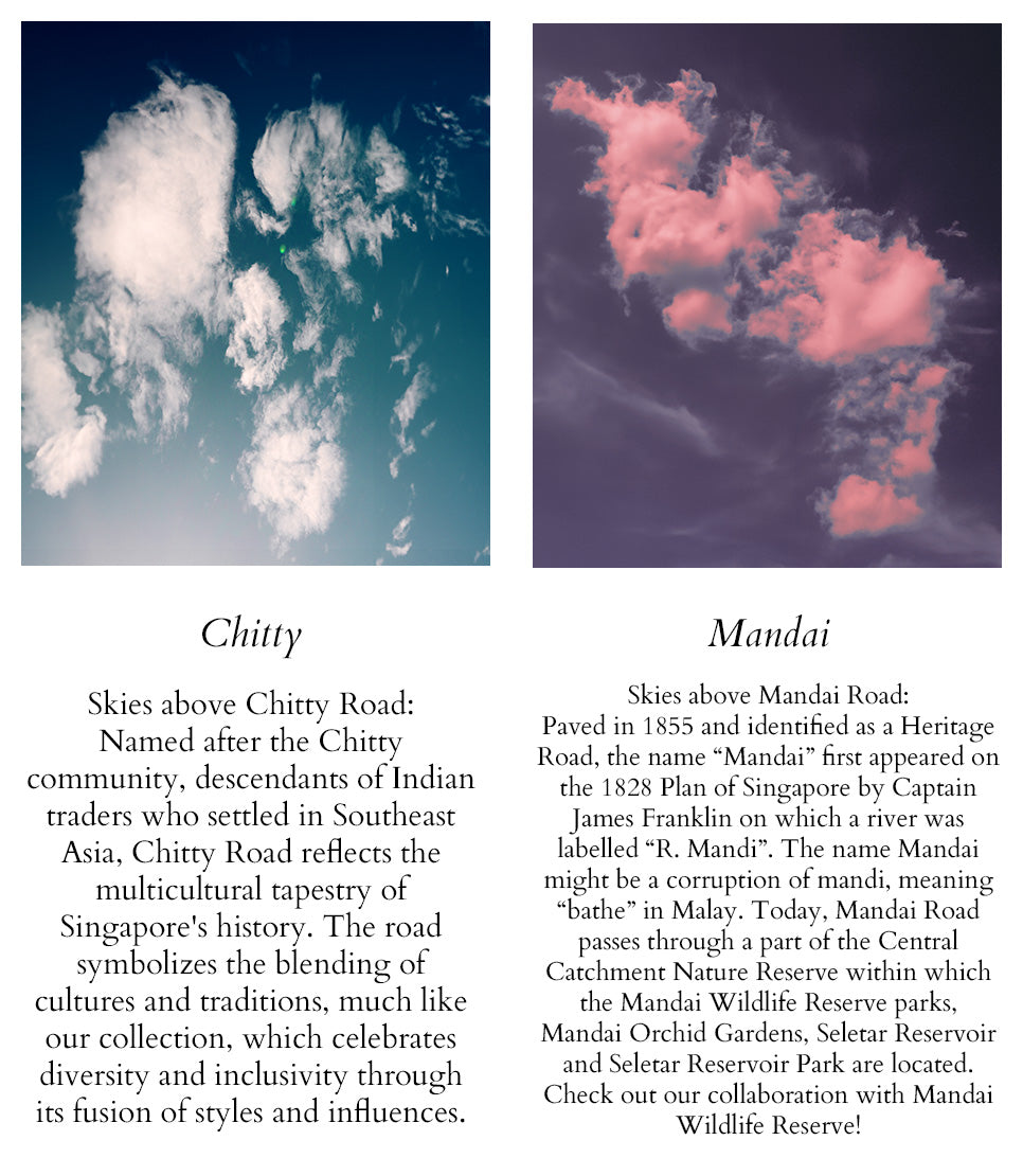 Echoing the poignant verses of Rita Dove's "Exit," our collection is adorned with 16 meticulously hand-painted watercolour prints. Each stroke evokes emotions of departure and renewal, encapsulating the transformative journey of metamorphosis and the unwavering resilience of the human spirit. As you explore our collection, you'll also discover 11 prints where we photographed the skies above 11 streets across Singapore. Each sky bears witness to the storied streets below, where the weight of history and the legacy of pioneers have shaped the landscape of our beloved city. From Alkaff Avenue to Nee Soon Road, our journey led us to these streets, where we not only captured the beauty of the skies but also delved into the rich history and narratives that define each locality. Through our lens, we pay homage to the resilience and progress embedded in the fabric of these streets, mirroring the evanescent beauty of clouds drifting across the sky.