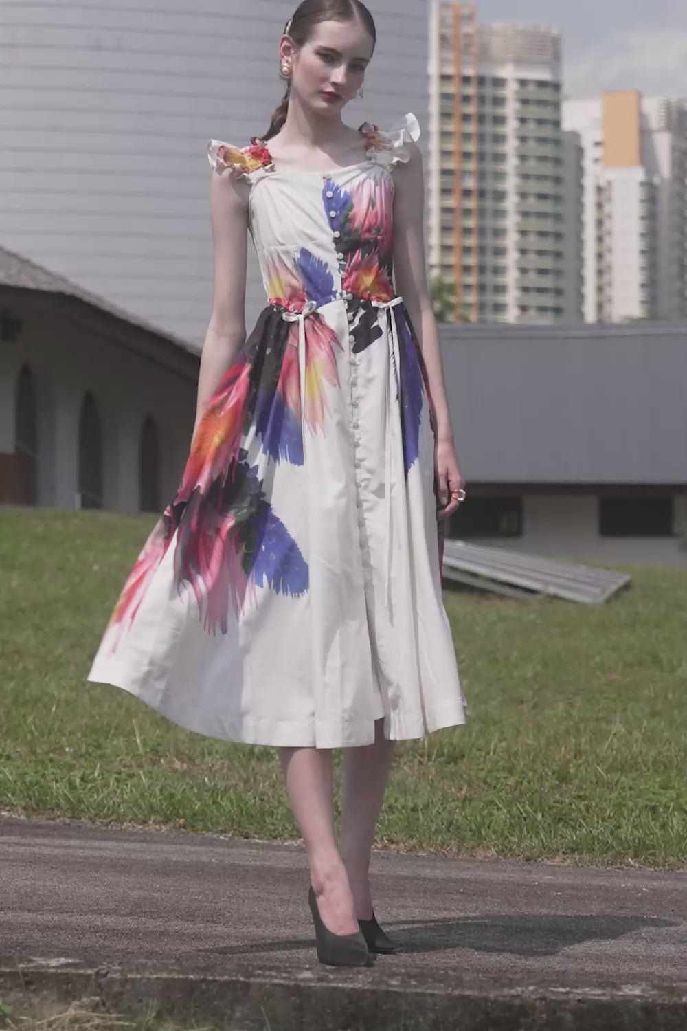 Our Bustier Butterfly Sleeveless Midi Dress features delicately ruffled shoulder straps, while the drawstring waist ties allow a sculpted silhouette, balancing structure with playful ease.