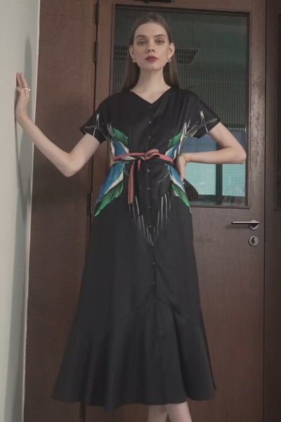Understated and sculpted, our Dolman Mermaid Dress gives a gentle slope to the shoulder, softening the silhouette while maintaining sharpness through the neckline and waist. A line of buttons draws the eye downward, tapering into a subtle flare at the hem that opens with movement. The print placement is deliberate, creating dimension through the sides and waist without overwhelming the dress’s structure. A striped sash adds a refined break in rhythm, cinching the shape with a touch of contrast.