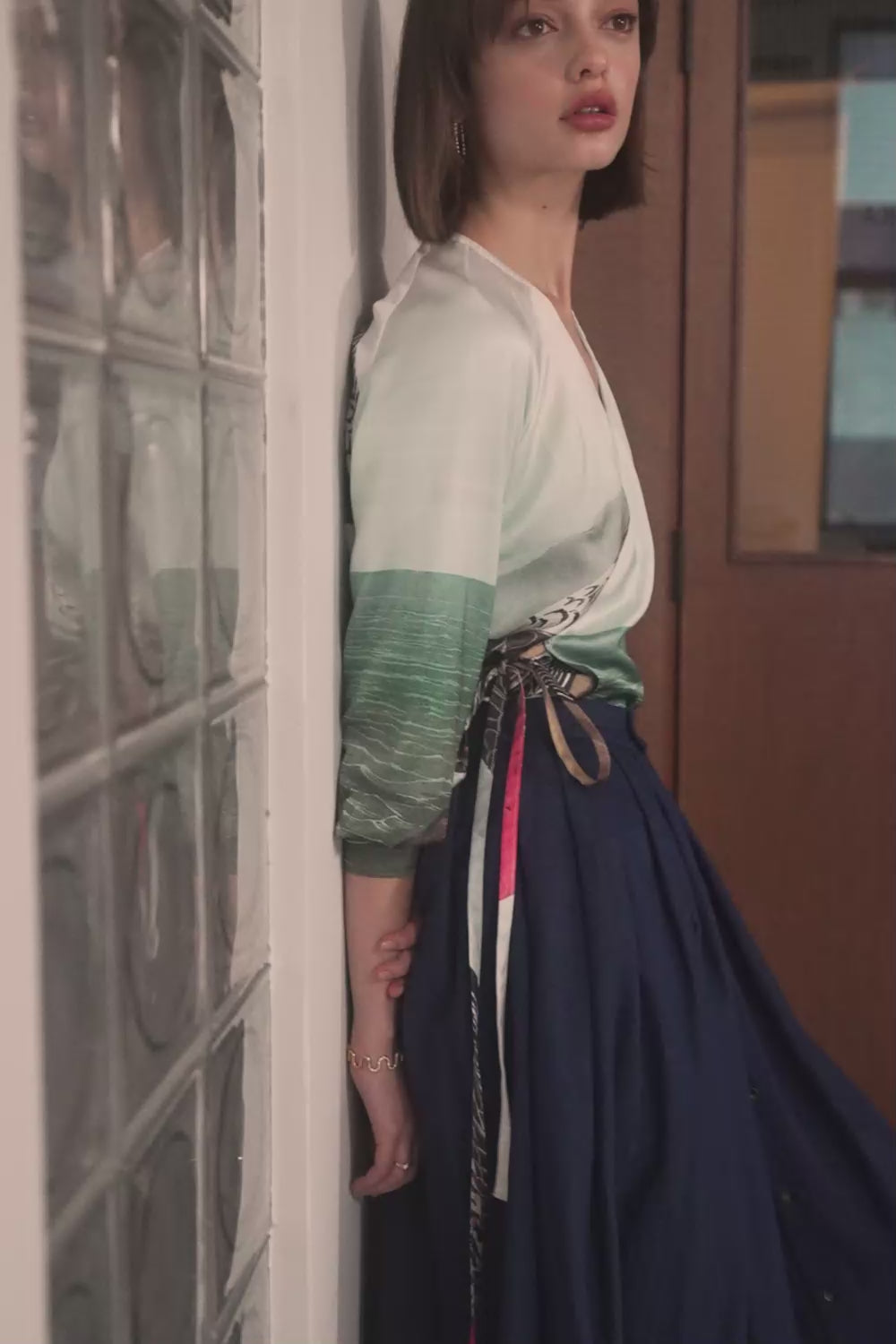 Structured but never stiff, our Dual Box Pleat Skirt is all about controlled volume. Cut from thin denim fabric, it is designed with a sharp dual box pleat construction that gives the skirt its rhythm, measured, architectural and assertive. The silhouette skims the waist before breaking into full pleats that fall to mid-calf, allowing movement without excess. A button-through front adds utilitarian edge, while the deep navy tone anchors the silhouette with a modern classicism that resists trend.