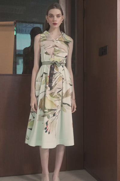 Crisp yet fluid, our Racer Pankou Dress balances sharp detail with soft movement. Defined by its soft, wide collar and anchored by a row of pankou fastenings, the silhouette draws from tradition but resists nostalgia. The bodice cuts clean along the shoulders and flares out to a wide A-line that drapes with graceful weight. A contrast ribbon belt cinches the shape without fuss, while the airy fabrication and botanical print lend it depth.