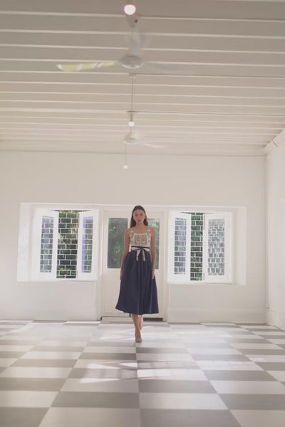 Our Bustier Box Pleats Dress from Reckless Ericka’s BELOVED collection brings together playful structure and soft nostalgia. The pin tucked bustier is its defining gesture, crafted to frame the décolletage with precision while introducing a rhythmic texture that feels both modern and romantic. From the waist, the skirt opens into generous box pleats, creating a full, statuesque volume that moves with a refined sweep. The bodice’s print adds a graphic dimension, playing against the deep navy skirt in a way that sharpens the entire composition. A striped sash ties the elements together, cinching the waist with a confident, polished contrast.