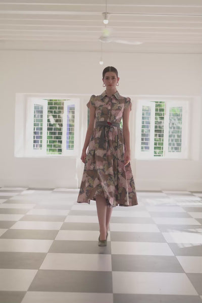 Our Snowdrop Sleeves Shirtwaist Dress from Reckless Ericka’s BELOVED collection brings a graceful structure to a timeless silhouette, weaving effortless romance into one considered form. The snowdrop sleeves sit gently at the shoulders, creating a soft line that complements the tailored shirt bodice. At the waist, the dress gathers into a full, swinging skirt that gives the pattern room to move, every movement shifts the artwork like petals in motion. A sash belt ties the look together and this dress honours the beauty of what is familiar and cherished, blending femininity, comfort, and expressive printwork in a way that feels timelessly Reckless Ericka.