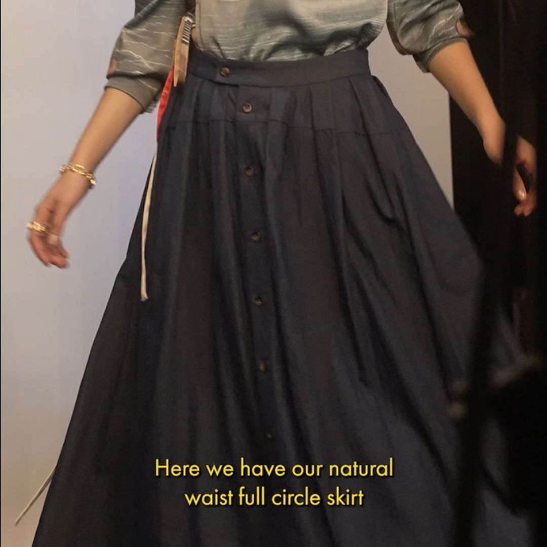 A natural-waist full circle skirt cut in our lightweight denim and finished with signature double pleats for sculpted volume. The fabric is a Tencel–rayon blend that drapes beautifully and feels cool against the skin.