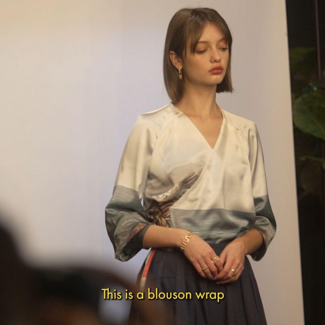 A blouson sleeve flatters most body shapes, and this wrap silhouette ties to your perfect fit. Cut in satin for a soft hand and subtle sheen, it feels easy on the skin and dresses up effortlessly.