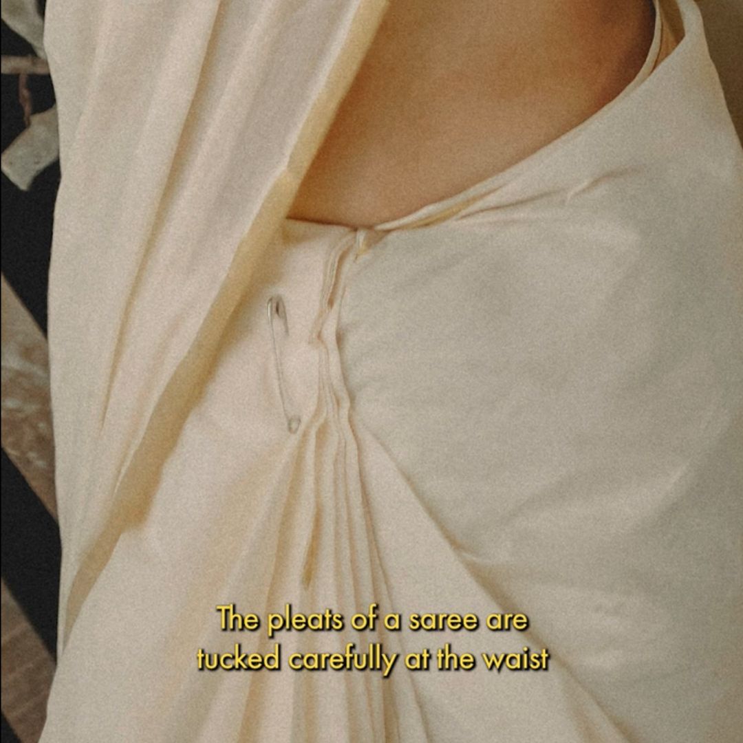The pleats of the saree are tucked carefully at the waist — giving both movement and dignity, while allowing six yards of fabric to flow around the body.