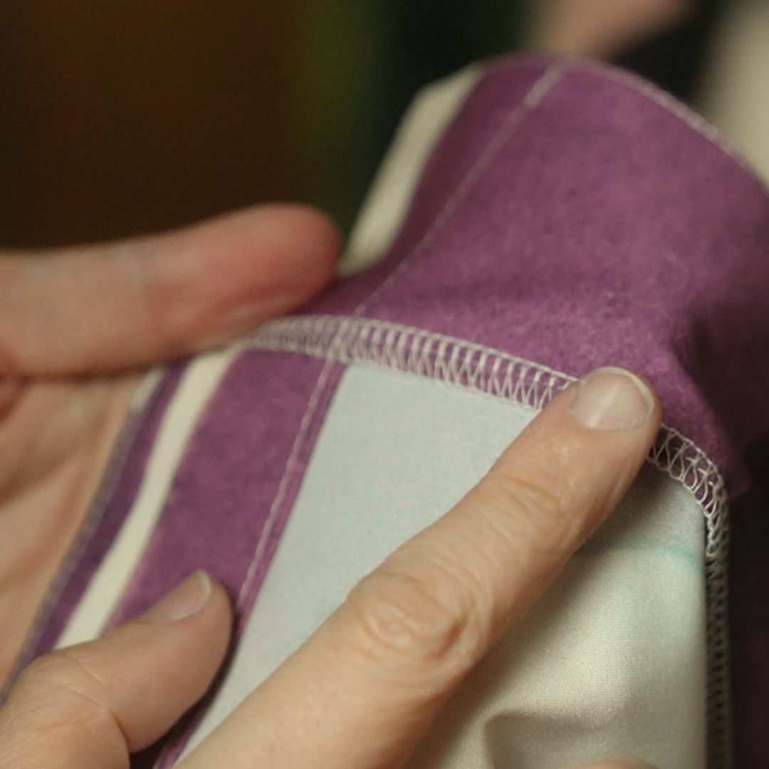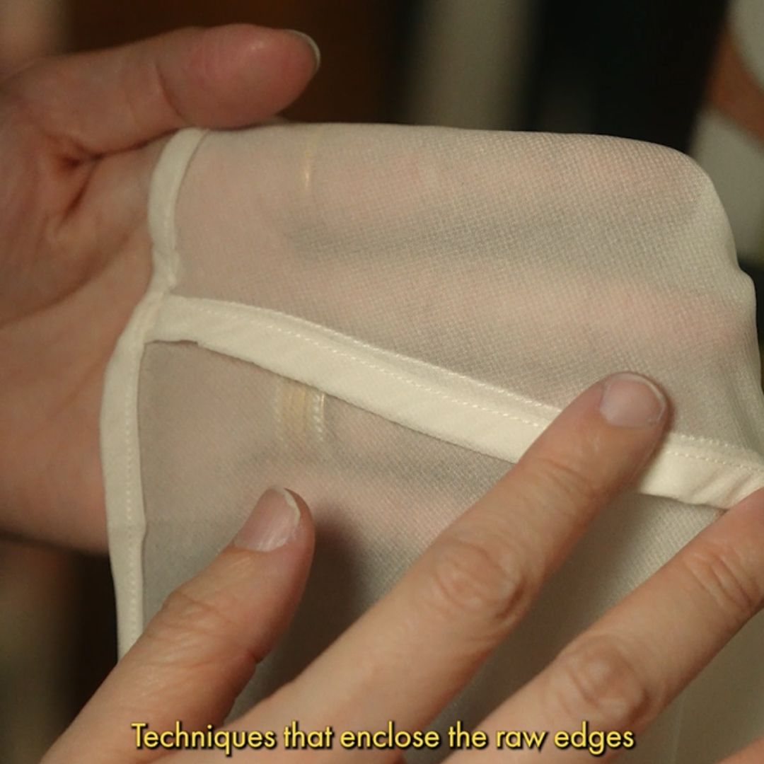 On sheer fabrics, we use piping or French seams — techniques that enclose every raw edge so nothing frays, nothing irritates, and the garment feels as graceful inside as it looks outside.