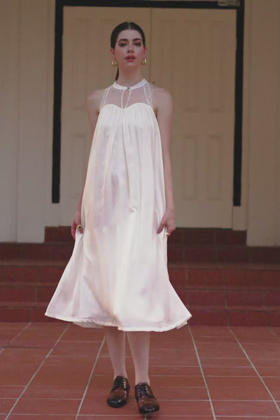 Our Air Dress from Reckless Ericka’s BELOVED collection is designed to feel almost weightless on the body while holding a dramatic silhouette. Cut in a fluid silhouette, it falls away from the frame with ease, animated by soft gathers along the bust line and back neck that create gentle movement as you walk. A lace halter detail traces the neckline, offering a refined contrast between sheerness and structure, while the open drape through the body keeps the dress feeling effortless.