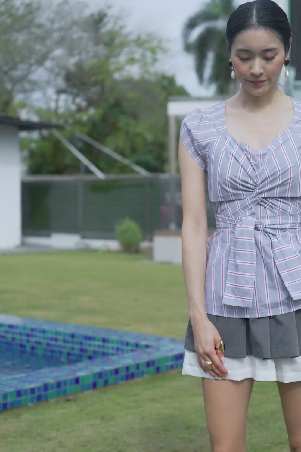 Drawstring Tiered Palazzo Shorts (Grey Stripes)