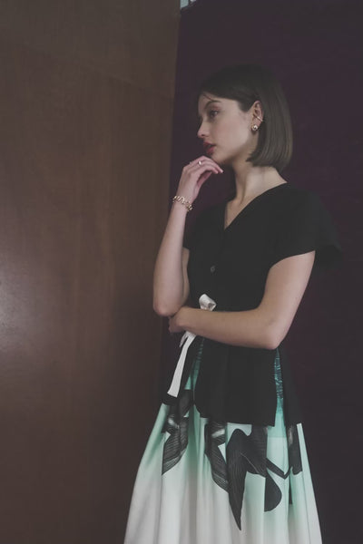 The crisp black structured bodice of our Fit & Flare Peplum Dress sits above a flowing full-circle skirt, printed with ethereal feather motifs that fan across ivory white satin. The silhouette evokes classic femininity with a modern stance where it is soft yet defined and effortlessly polished. The ribbon sash ties it all together, offering waist definition while adding a gentle touch of grace.