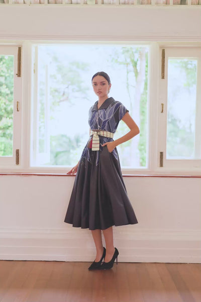 Our Pilgrim Dolman Dress from Reckless Ericka’s BELOVED collection brings a polished ease to a vintage-leaning silhouette, made for days when you want to look considered without feeling restricted. The pilgrim fold-over collar frames the neckline, while short dolman sleeves soften the shoulder and keep the shape relaxed through the bodice. A sash belt defines the waist, then the skirt opens into generous volume with a button-down front that adds structure and practicality in one. Rendered in a deep navy base with electric blue botanical strokes, the print feels bold yet wearable, and the striped sash introduces a sharp contrast that pulls the whole look together.