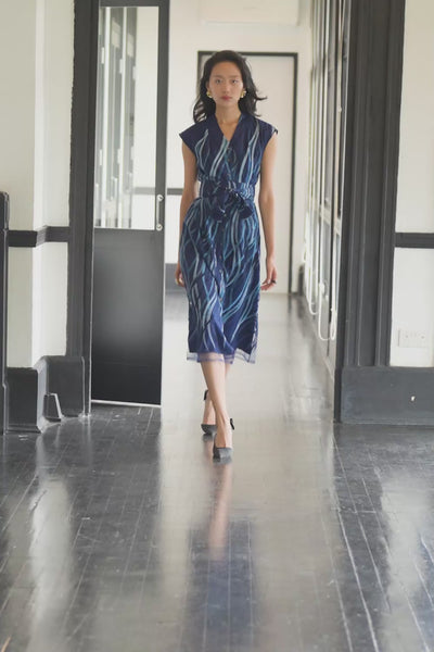 Our Nocturne Column Dress from Reckless Ericka’s ABIDE collection is a study in fluid line and intricate surface. The silhouette follows a clean column shape that elongates the body, falling straight from shoulder to hem with composed ease. The fabric is an embroidered tulle, pleated to create depth and dimension, with sweeping threads in tonal blues that move across the surface like painterly strokes. A soft V neckline frames the collarbone, while a full button front introduces structure and versatility.