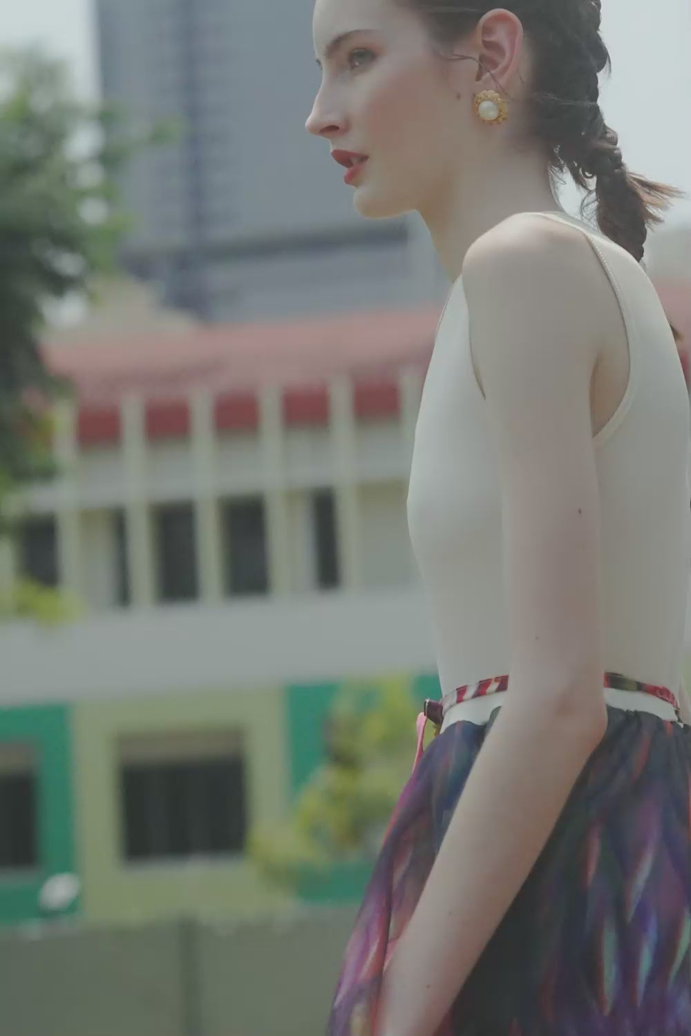 The Ribbed Sleeveless Drawstring Swing Dress is an effortless blend of structure and fluidity. The ribbed bodice hugs the form with a clean, minimalist silhouette, while the drawstring waist introduces a customisable fit, cinching gently to highlight the waist. From the waist flows a sheer, voluminous swing skirt, adorned with an ethereal print of cascading botanicals in deep blues and verdant greens, overlay with a soft red organza fabric, creating a dreamy play of colour and movement with every step.