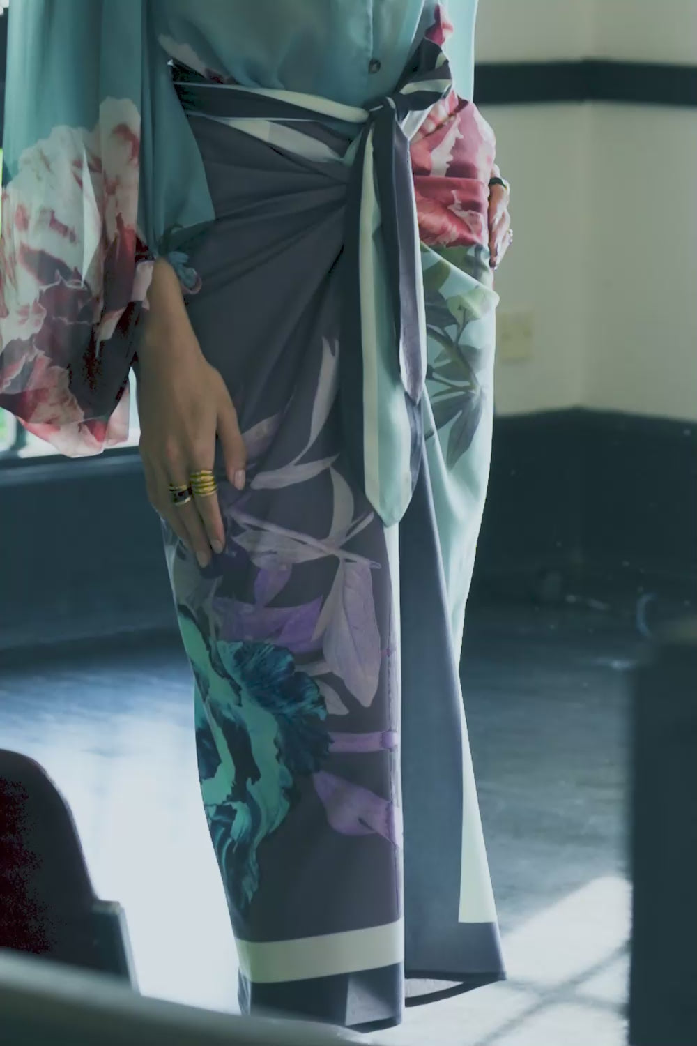 The print unfolds in rich, illustrative panels that wrap the body with a painterly rhythm, while the sarong construction is thoughtfully engineered so it drapes effortlessly, tying with ease while maintaining the sculptural beauty of a traditional wrap. What was once a multi-step ritual is now a single, fluid gesture; the sarong secures with ease, draping into those familiar folds that speak of heritage, yet landing with the sharpness of contemporary styling. Its length and placement of pattern elongate the silhouette, allowing the artwork to cascade in uninterrupted flow.