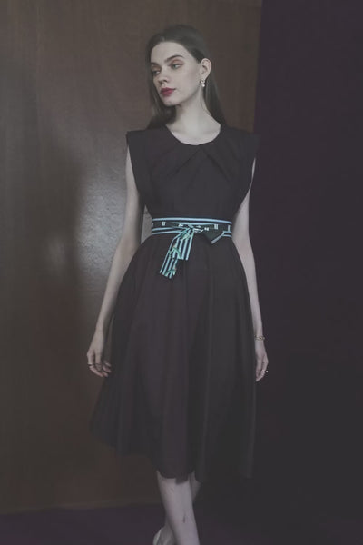 Our Square Sleeve Fold Dress features a pleated neckline that brings structure to softness, lending a subtle fold that draws the eye upward while setting the tone for the clean geometry of the squared sleeves. Cut in a deep, textured fabric, the dress holds its form while allowing the skirt to fall in an easy flare, cinched at the waist with a striped sash that lends rhythm and contrast.