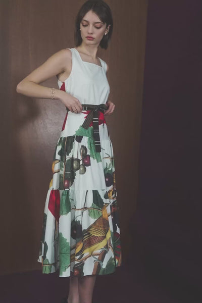 Each tier becomes a canvas for the print, birds in golden ochre, crimson, and deep plum set among green foliage and ripened fruit, transforming the skirt into a layered story that moves as the wearer does.